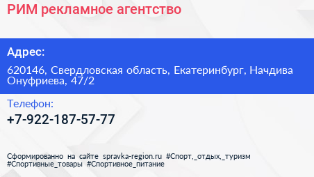 РИМ, рекламное агентство по адресу 620146, Свердловская область, Екатеринбург, Начдива Онуфриева, 47/2 в дальнейшем Организация, размещена в следующих категориях: