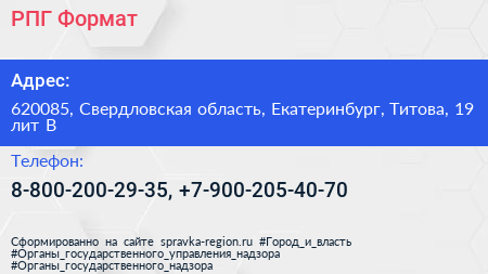 РПГ Формат по адресу 620085, Свердловская область, Екатеринбург, Титова, 19 лит В в дальнейшем Организация, размещена в следующих категориях: