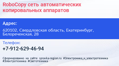 RoboCopy, сеть автоматических копировальных аппаратов по адресу 620102, Свердловская область, Екатеринбург, Белореченская, 28 в дальнейшем Организация, размещена в следующих категориях: