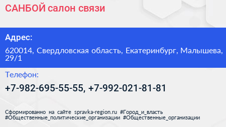 САНБОЙ, салон связи по адресу 620014, Свердловская область, Екатеринбург, Малышева, 29/1 в дальнейшем Организация, размещена в следующих категориях: