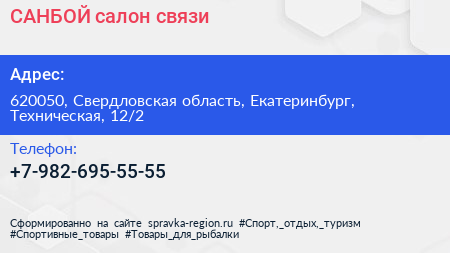 САНБОЙ, салон связи по адресу 620050, Свердловская область, Екатеринбург, Техническая, 12/2 в дальнейшем Организация, размещена в следующих категориях: