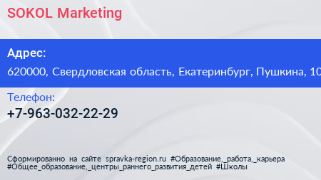 SOKOL Marketing по адресу 620000, Свердловская область, Екатеринбург, Пушкина, 10 в дальнейшем Организация, размещена в следующих категориях: