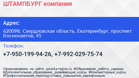 ШТАМПБУРГ, компания по адресу 620098, Свердловская область, Екатеринбург, проспект Космонавтов, 45 в дальнейшем Организация, размещена в следующих категориях: