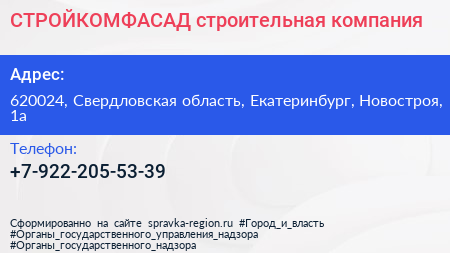 СТРОЙКОМФАСАД, строительная компания по адресу 620024, Свердловская область, Екатеринбург, Новостроя, 1а в дальнейшем Организация, размещена в следующих категориях: