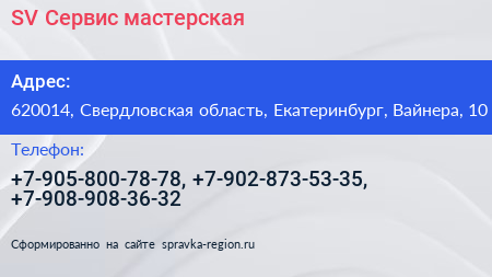 SV-Сервис, мастерская по адресу 620014, Свердловская область, Екатеринбург, Вайнера, 10 в дальнейшем Организация, размещена в следующих категориях: