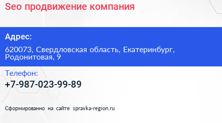 Seo продвижение, компания по адресу 620073, Свердловская область, Екатеринбург, Родонитовая, 9 в дальнейшем Организация, размещена в следующих категориях: