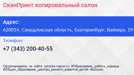 СканПринт, копировальный салон по адресу 620014, Свердловская область, Екатеринбург, Вайнера, 19 в дальнейшем Организация, размещена в следующих категориях: