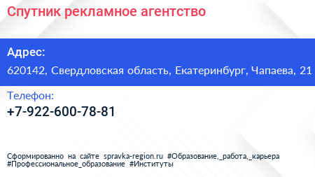 Спутник, рекламное агентство по адресу 620142, Свердловская область, Екатеринбург, Чапаева, 21 в дальнейшем Организация, размещена в следующих категориях: