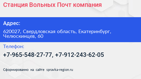 Станция Вольных Почт, компания по адресу 620027, Свердловская область, Екатеринбург, Челюскинцев, 60 в дальнейшем Организация, размещена в следующих категориях: