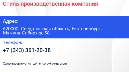 Стиль, производственная компания по адресу 620000, Свердловская область, Екатеринбург, Мамина-Сибиряка, 58 в дальнейшем Организация, размещена в следующих категориях: