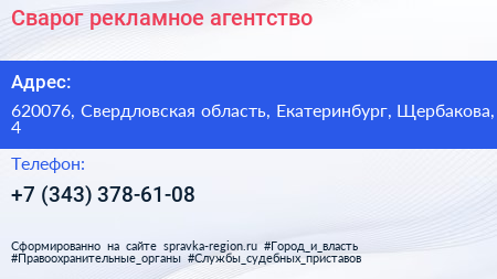 Сварог, рекламное агентство по адресу 620076, Свердловская область, Екатеринбург, Щербакова, 4 в дальнейшем Организация, размещена в следующих категориях: