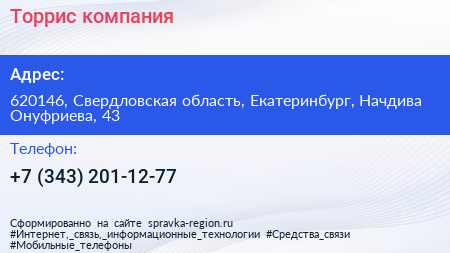 Торрис, компания по адресу 620146, Свердловская область, Екатеринбург, Начдива Онуфриева, 43 в дальнейшем Организация, размещена в следующих категориях: