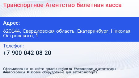 Транспортное Агентство, билетная касса по адресу 620144, Свердловская область, Екатеринбург, Николая Островского, 1 в дальнейшем Организация, размещена в следующих категориях: