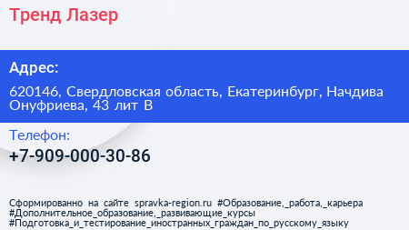 Тренд Лазер по адресу 620146, Свердловская область, Екатеринбург, Начдива Онуфриева, 43 лит В в дальнейшем Организация, размещена в следующих категориях: