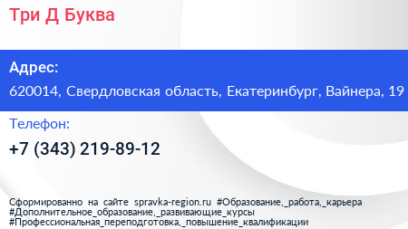 Три Д Буква по адресу 620014, Свердловская область, Екатеринбург, Вайнера, 19 в дальнейшем Организация, размещена в следующих категориях: