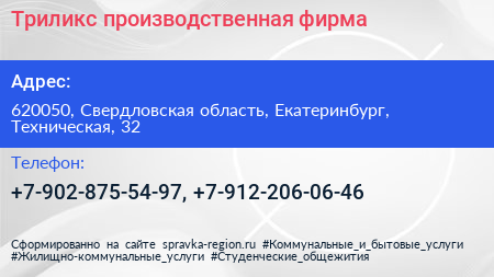Триликс, производственная фирма по адресу 620050, Свердловская область, Екатеринбург, Техническая, 32 в дальнейшем Организация, размещена в следующих категориях:
