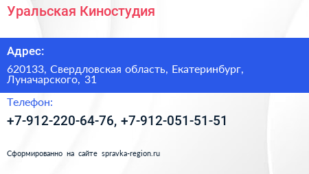 Уральская Киностудия по адресу 620133, Свердловская область, Екатеринбург, Луначарского, 31 в дальнейшем Организация, размещена в следующих категориях: