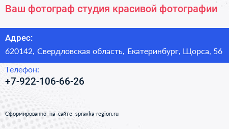 Ваш фотограф, студия красивой фотографии по адресу 620142, Свердловская область, Екатеринбург, Щорса, 56 в дальнейшем Организация, размещена в следующих категориях: