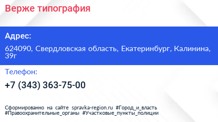 Верже, типография по адресу 624090, Свердловская область, Екатеринбург, Калинина, 39г в дальнейшем Организация, размещена в следующих категориях:
