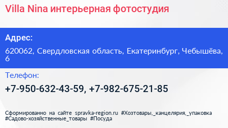 Villa Nina, интерьерная фотостудия по адресу 620062, Свердловская область, Екатеринбург, Чебышёва, 6 в дальнейшем Организация, размещена в следующих категориях: