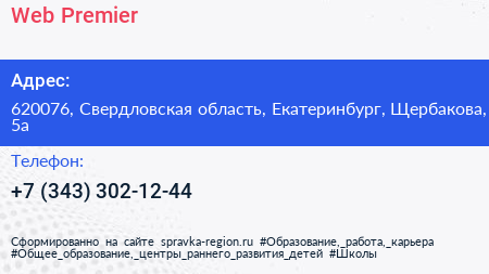 Web-Premier по адресу 620076, Свердловская область, Екатеринбург, Щербакова, 5а в дальнейшем Организация, размещена в следующих категориях: