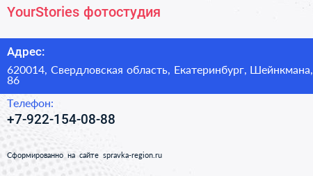 YourStories, фотостудия по адресу 620014, Свердловская область, Екатеринбург, Шейнкмана, 86 в дальнейшем Организация, размещена в следующих категориях: