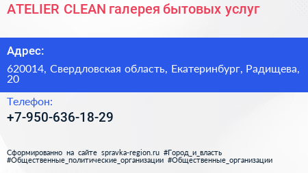 ATELIER-CLEAN, галерея бытовых услуг по адресу 620014, Свердловская область, Екатеринбург, Радищева, 20 в дальнейшем Организация, размещена в следующих категориях: