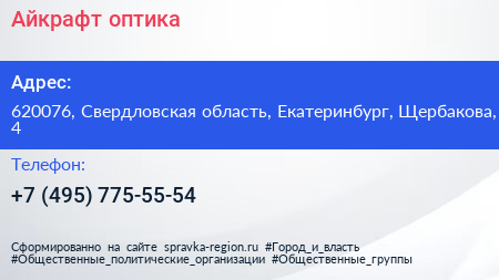 Айкрафт, оптика по адресу 620076, Свердловская область, Екатеринбург, Щербакова, 4 в дальнейшем Организация, размещена в следующих категориях: