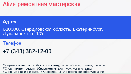 Alize, ремонтная мастерская по адресу 620000, Свердловская область, Екатеринбург, Луначарского, 139 в дальнейшем Организация, размещена в следующих категориях: