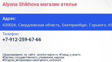 Alyona Shikhova, магазин-ателье по адресу 620026, Свердловская область, Екатеринбург, Горького, 65 в дальнейшем Организация, размещена в следующих категориях: