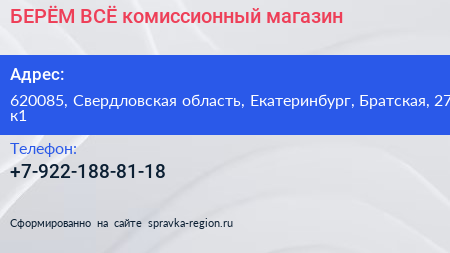 БЕРЁМ ВСЁ!, комиссионный магазин по адресу 620085, Свердловская область, Екатеринбург, Братская, 27 к1 в дальнейшем Организация, размещена в следующих категориях:
