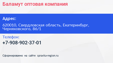 Баламут, оптовая компания по адресу 620010, Свердловская область, Екатеринбург, Черняховского, 86/1 в дальнейшем Организация, размещена в следующих категориях: