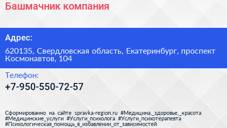 Для связи с организацией воспользуйтесь номером телефона: +7-950-550-72-57. Ежедневно с 10:00 до 21:00, вы можете обратиться в эту организацию.