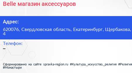 Belle, магазин аксессуаров по адресу 620076, Свердловская область, Екатеринбург, Щербакова, 4 в дальнейшем Организация, размещена в следующих категориях: