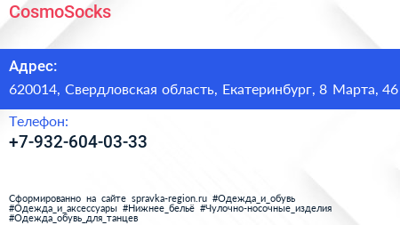 CosmoSocks по адресу 620014, Свердловская область, Екатеринбург, 8 Марта, 46 в дальнейшем Организация, размещена в следующих категориях: