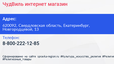 ЧудВиль, интернет-магазин по адресу 620092, Свердловская область, Екатеринбург, Новгородцевой, 13 в дальнейшем Организация, размещена в следующих категориях: