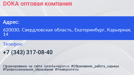 DOKA, оптовая компания по адресу 620030, Свердловская область, Екатеринбург, Карьерная, 14 в дальнейшем Организация, размещена в следующих категориях: