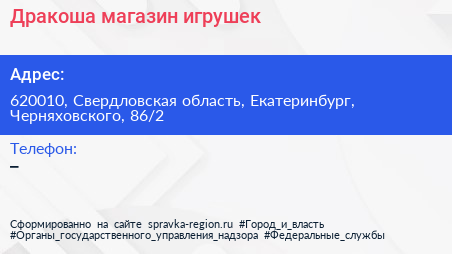 Дракоша, магазин игрушек по адресу 620010, Свердловская область, Екатеринбург, Черняховского, 86/2 в дальнейшем Организация, размещена в следующих категориях: