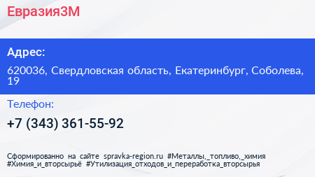 Евразия3М по адресу 620036, Свердловская область, Екатеринбург, Соболева, 19 в дальнейшем Организация, размещена в следующих категориях:
