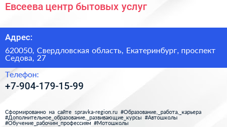 Евсеева, центр бытовых услуг по адресу 620050, Свердловская область, Екатеринбург, проспект Седова, 27 в дальнейшем Организация, размещена в следующих категориях: