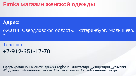 Fimka, магазин женской одежды по адресу 620014, Свердловская область, Екатеринбург, Малышева, 5 в дальнейшем Организация, размещена в следующих категориях: