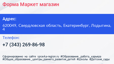 Форма-Маркет, магазин по адресу 620049, Свердловская область, Екатеринбург, Лодыгина, 4 в дальнейшем Организация, размещена в следующих категориях: