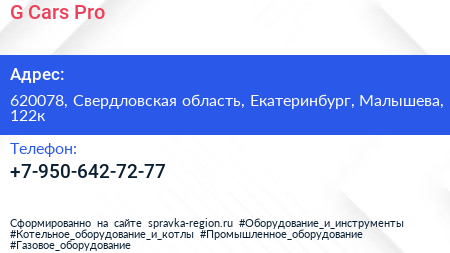 G-Cars.Pro по адресу 620078, Свердловская область, Екатеринбург, Малышева, 122к в дальнейшем Организация, размещена в следующих категориях: