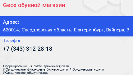 Geox, обувной магазин по адресу 620014, Свердловская область, Екатеринбург, Вайнера, 9 в дальнейшем Организация, размещена в следующих категориях: