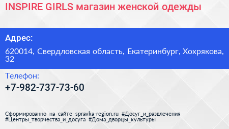 INSPIRE GIRLS, магазин женской одежды по адресу 620014, Свердловская область, Екатеринбург, Хохрякова, 32 в дальнейшем Организация, размещена в следующих категориях: