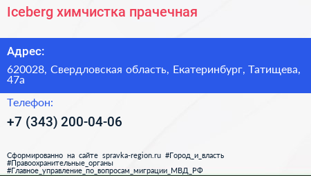 Iceberg, химчистка-прачечная по адресу 620028, Свердловская область, Екатеринбург, Татищева, 47а в дальнейшем Организация, размещена в следующих категориях: