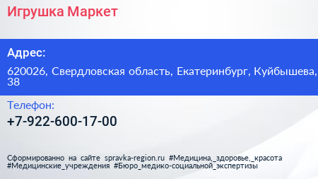 Игрушка Маркет по адресу 620026, Свердловская область, Екатеринбург, Куйбышева, 38 в дальнейшем Организация, размещена в следующих категориях: