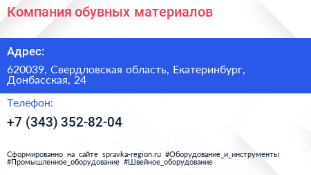 Компания обувных материалов по адресу 620039, Свердловская область, Екатеринбург, Донбасская, 24 в дальнейшем Организация, размещена в следующих категориях: