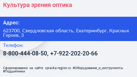 Культура зрения, оптика по адресу 623700, Свердловская область, Екатеринбург, Красных Героев, 3 в дальнейшем Организация, размещена в следующих категориях: