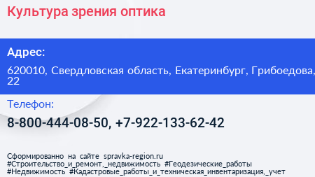 Культура зрения, оптика по адресу 620010, Свердловская область, Екатеринбург, Грибоедова, 22 в дальнейшем Организация, размещена в следующих категориях: